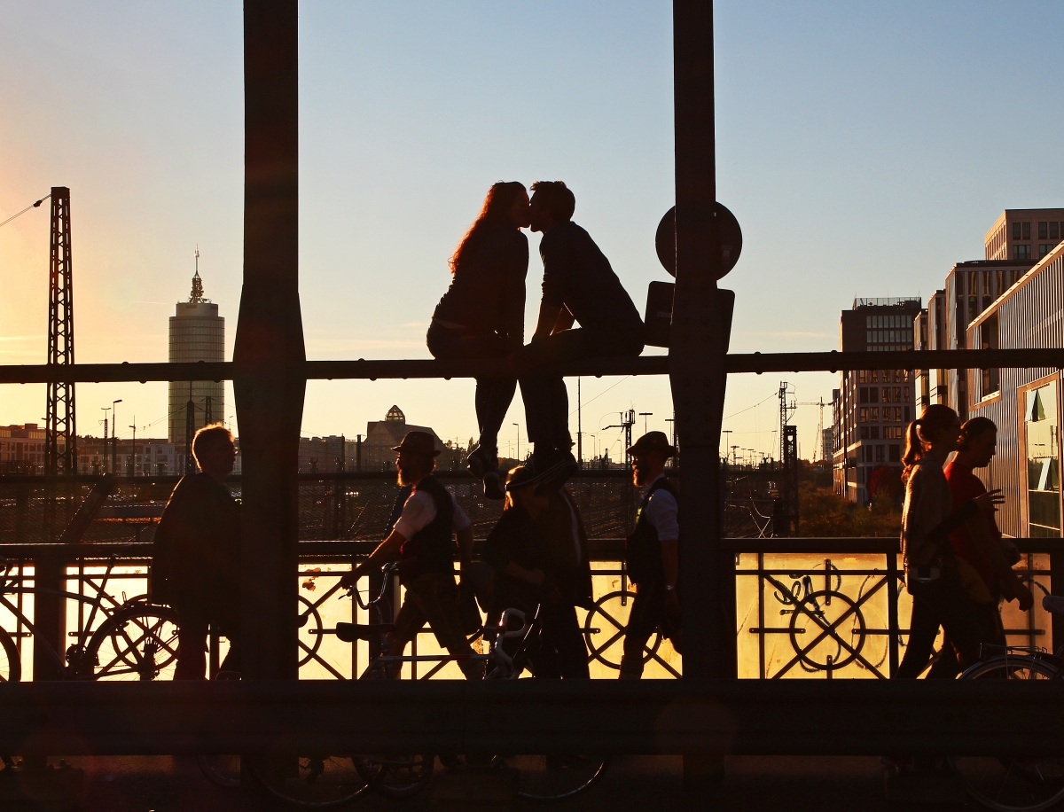 The sun sets, love rises. I photographed this scene on a bridge in Munich. Passersby hurry past and a loving couple form a unity in the late evening light. AUTHOR